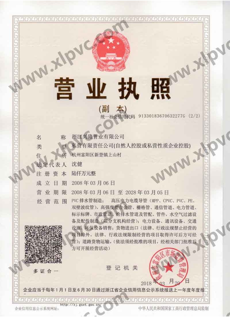 浙江興隆管業有限公司位于杭州市富陽區(杭州第九新區),坐落在新登鎮,相距杭州僅60公里,水、陸、空交通運輸十分便利。浙江興隆管業有限公司前身為富陽興隆塑料制品廠,成立于1992年,2008年改名浙江興隆管業有限公司,數十年來,公司一直至力于管道的生產,目前公司擁有國內先進的CPVC保護管生產線,HPVC()雙壁波紋管生產線,多孔管生產線,玻璃鋼電纜保護管生產線、MPP電纜保護管生產線。生產的主要產品有:CPVC電纜保護管、MPP電力電纜保護管(頂管)、高強度塑合金管、HDPE給排水管、HPVC()雙壁波紋管、玻璃鋼電纜保護管、埋地通信用的PVC-U多孔管、PE直壁管、PVC-U雙壁波紋管、梅花管等,年生產能力達20000萬米。